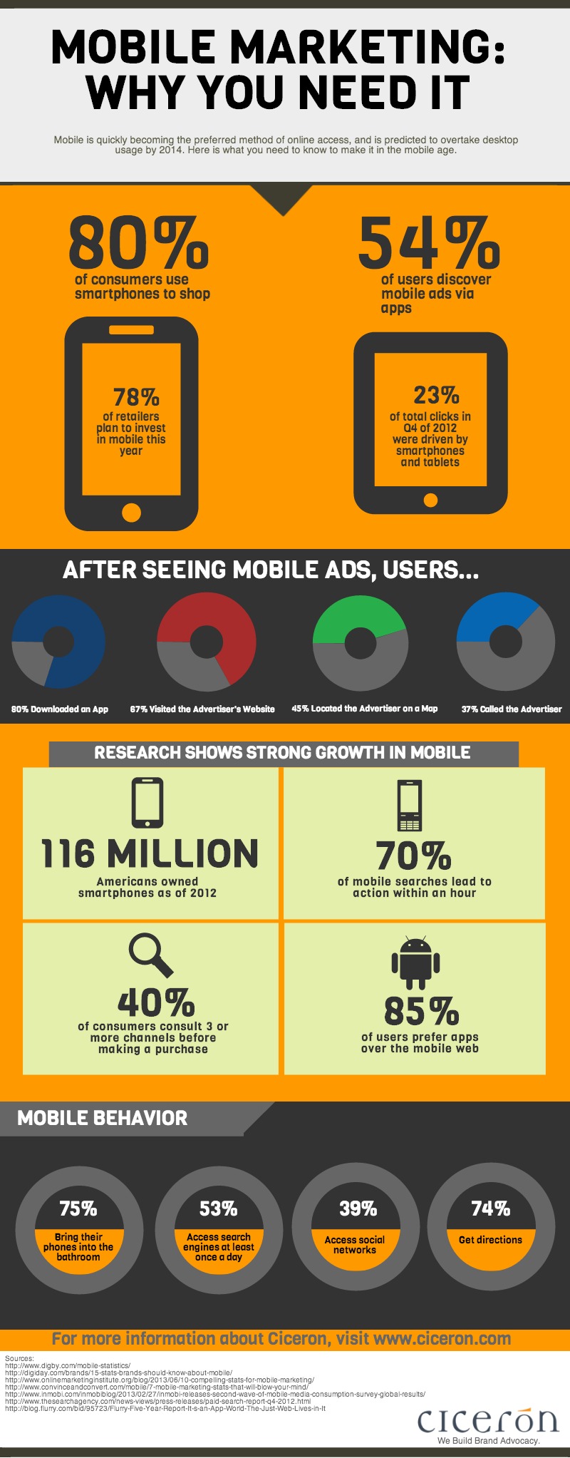 ปัจจุบันโทรศัพท์มือถือกลายเป็นช่องทางในการใช้งานอินเทอร์เน็ตที่ได้รับความนิยม และมีการใช้งานอย่างแพร่หลายในทั่วโลก ซึ่งส่งผลทำให้กิจกรรมที่เกี่ยวข้องกับการใช้งานโทรศัพท์มือถืออย่าง “การทำการตลาดบนโทรศัพท์มือถือ (Mobile Marketing)” ได้รับอานิสงส์ควบคู่กันไปด้วย ซึ่งการสำรวจข้อมูลของเว็บไซต์ Ciceron.com ระบุว่า พฤติกรรมของผู้บริโภคชาวอเมริกันเป็นสิ่งที่ช่วยสะท้อนได้เป็นอย่างดีถึงความจำเป็นของการทำการตลาดบนมือถือ โดยผลการสำรวจพบว่าปัจจุบันกลุ่มผู้บริโภคชาวอเมริกันมีพฤติกรรมในการใช้โทรศัพท์เพื่อซื้อสินค้ามากถึง 80% และไม่เพียงเท่านั้นกว่า 70% ของผู้บริโภคที่การค้นหาข้อมูลบนโทรศัพท์มือถือ ยังนำไปสู่การซื้อสินค้าภายในเวลาเพียงแค่ 1 ชั่วโมงเท่านั้น