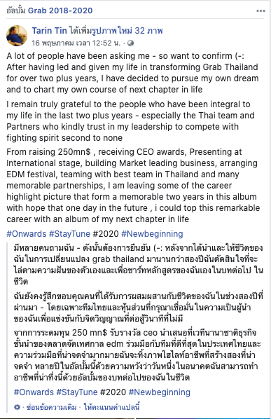 บริษัทฯ ขอขอบคุณคุณธรินทร์สำหรับความมุ่งมั่นและความทุ่มเทในการทำงานตลอดระยะเวลากว่า 2 ปีของการดำรงตำแหน่งเป็นกรรมการผู้จัดการใหญ่ แกร็บ ประเทศไทย โดยคุณธรินทร์ถือเป็นผู้นำองค์กรที่มีวิสัยทัศน์อันโดดเด่น ซึ่งได้ขับเคลื่อนและผลักดันให้ธุรกิจของแกร็บในประเทศไทยเติบโตอย่างต่อเนื่อง โดยมุ่งเน้นการตอบสนองความต้องการของผู้บริโภคในทุกด้านผ่านบริการต่างๆ