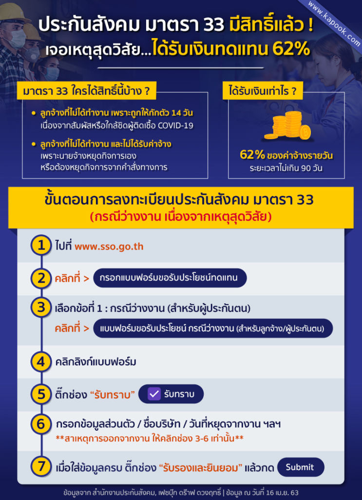 สำนักงานประกันสังคมได้แถลงมติเยียวยาผู้ประกันตน “ประกันสังคมมาตรา 33” ที่ได้รับผลกระทบ โดยจะได้รับร้อยละ 62 ของค่าจ้าง เฉลี่ยคนละ 7,000 – 8,000 บาท เป็นระยะเวลา 90 วัน