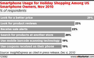 จากข้อมูลผลสำรวจเพื่อศึกษาการใช้งาน Smartphone ช่วงวันหยุดในเดือนพย. 2010 พบว่า กิจกรรมที่ช่วยตัดสินใจในการซื้อของ อันดับ1?คือ การใช้ Smartphone เพื่อค้นหาราคาสินค้าที่ถูกใจ คิดเป็น 29% รองลงมาคือ เพื่ออ่านรีวิวของผลิตภัณฑ์ (23%) และไว้รับข่าวการลดราคา (22%)