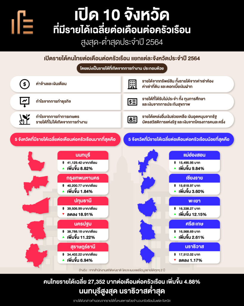 สำนักงานสถิติแห่งชาติ สำรวจภาวะเศรษฐกิจและสังคมของครัวเรือนไทย ปี พ.ศ. 2564 โดยได้เผยข้อมูลรายได้เฉลี่ยต่อเดือนต่อครัวเรือน แยกรายจังหวัด ทีมงาน Thumbsup จึงได้หยิบข้อมูลรายได้ 10 จังหวัดที่มีความน่าสนใจในเชิงภาพย่อยของจังหวัดและภาพรวมของประเทศ