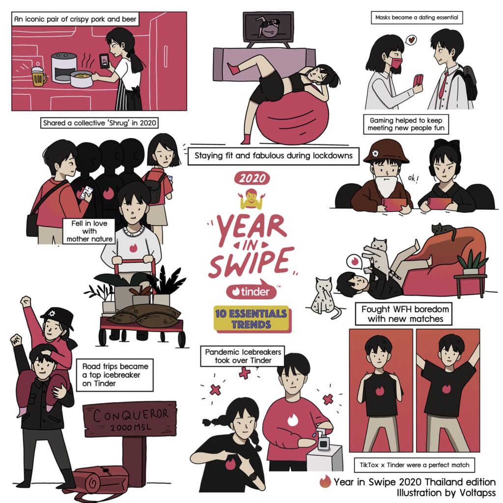 Tinder ได้สำรวจโปรไฟล์ของเหล่าสมาชิกในเมืองไทยในช่วงปี 2020 ที่ผ่านมา และสรุป 10 เทรนด์ฮอตที่เกิดขึ้นบน Tinder ในปี 2020 ดังต่อไปนี้