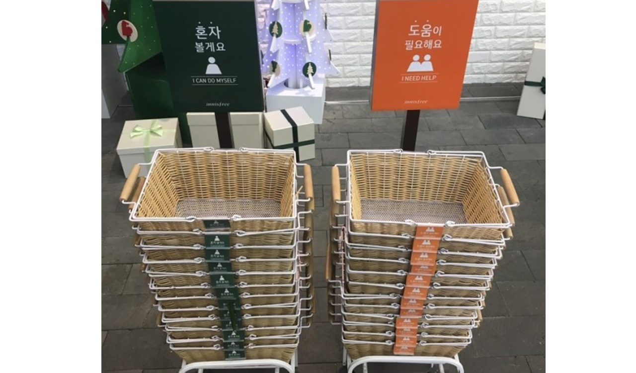 บริษัทเครื่องสำอางจากเกาหลีใต้ Innisfree จึงแก้ปัญหานี้ด้วยการออกแบบตะกร้าใส่สินค้าสองแบบสำหรับความต้องการที่แตกต่างกันเสียเลย แบบแรกติดป้ายสีเขียวสำหรับลูกค้าที่ไม่ต้องการความช่วยเหลือจากพนักงานในระหว่างซื้อ แบบที่สองติดป้ายสีส้ม ที่หมายถึงพนักงานสามารถเข้ามาให้ความช่วยเหลือ หรือแนะนำได้ เพียงเท่านี้ก็ช่วยลดความตึงเครียดจากความไม่เข้าใจกันได้ และช่วยให้พนักงานของร้านสามารถให้คำแนะนำกับลูกค้าได้ตรงกับความต้องการมากขึ้น
