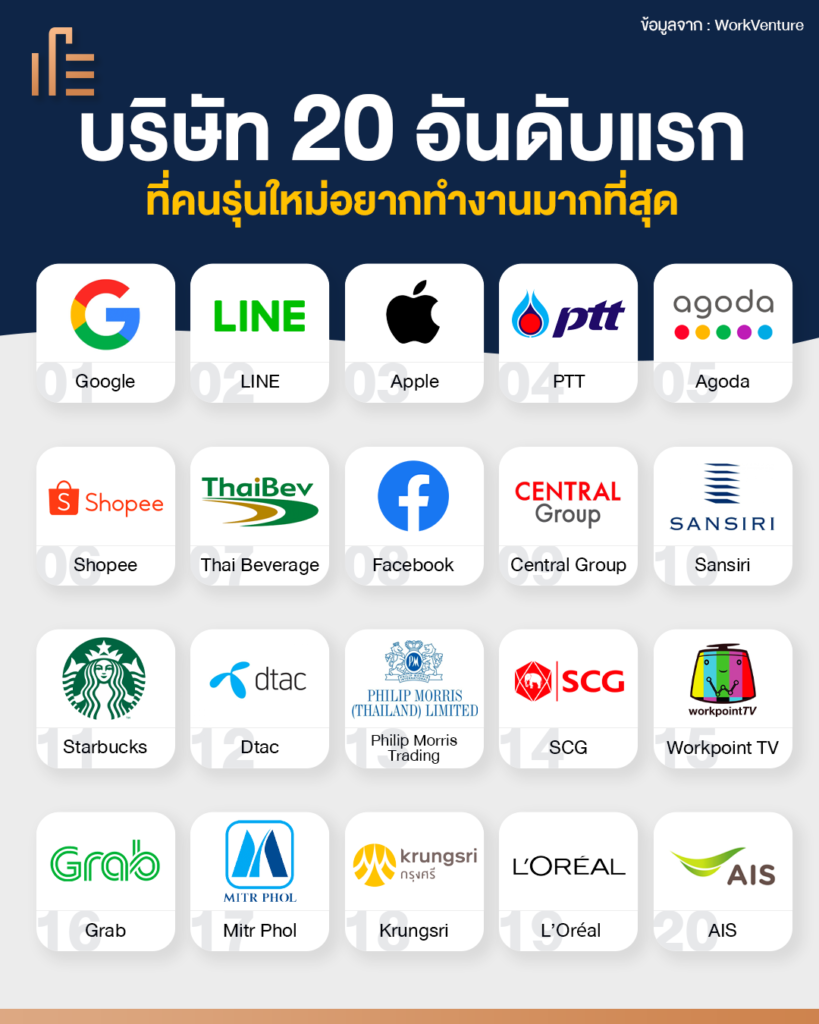 WorkVenture เว็บไซต์ค้นหางานที่มีผู้เข้าใช้บริการมากกว่า 5 ล้านคน ได้เผยอันดับ 20 บริษัทที่คนรุ่นใหม่สนใจร่วมงานด้วยมากที่สุดในปี 2020