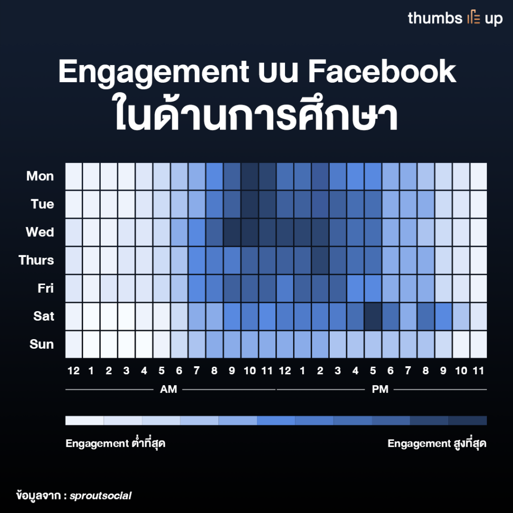 Facebook กลายเป็นแหล่งข้อมูลชั้นยอดสำหรับสถาบันการศึกษา ถ้าลองเทียบ Engagement กับอุตสาหกรรมอื่นๆ จะพบว่าช่วงเช้าและช่วงกลางคืนถือเป็นช่วงเวลาที่ดีสำหรับสร้างโอกาสให้กับสถาบันการศึกษาต่างๆ เพื่อทำให้ผู้ใช้เห็นเนื้อหาและกิจกรรมในช่วงสุดสัปดาห์