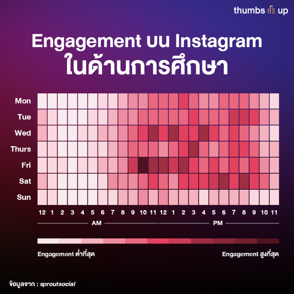 สำหรับสถาบันการศึกษาต่างๆ นั้น Instagram ถือเป็นช่องทางชั้นดีในการสร้างภาพจำและประสบการณ์ในแง่บวกแก่สถาบันนั้นๆ รูปแบบ Engagement ของสถาบันการศึกษา จะให้เคียงกับช่วงเวลาที่นักเรียนกำลังเรียนอยู่ และ Engagement จะมีมากขึ้นในช่วงบ่ายของวันจันทร์-ศุกร์ ถือเป็นช่วงเวลาที่มีโทรศัพท์เข้ามาสอบถามข้อมูลจากสถาบันการศึกษานั่นเอง