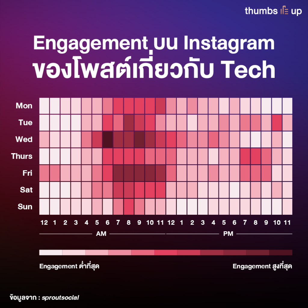 Engagement ของโพสต์สายเทคโนโลยีบน Instagram จะต่างจากภาพรวมที่เกิดขึ้นอยู่พอสมควร เพราะผู้ใช้จะเห็นกิจกรรมที่โพสต์ช้าไปหนึ่งวัน นั่นหมายความว่าผู้ชมส่วนใหญ่จะเห็นโพสต์สาย Tech ในช่วงเช้า-สายนั่นเอง