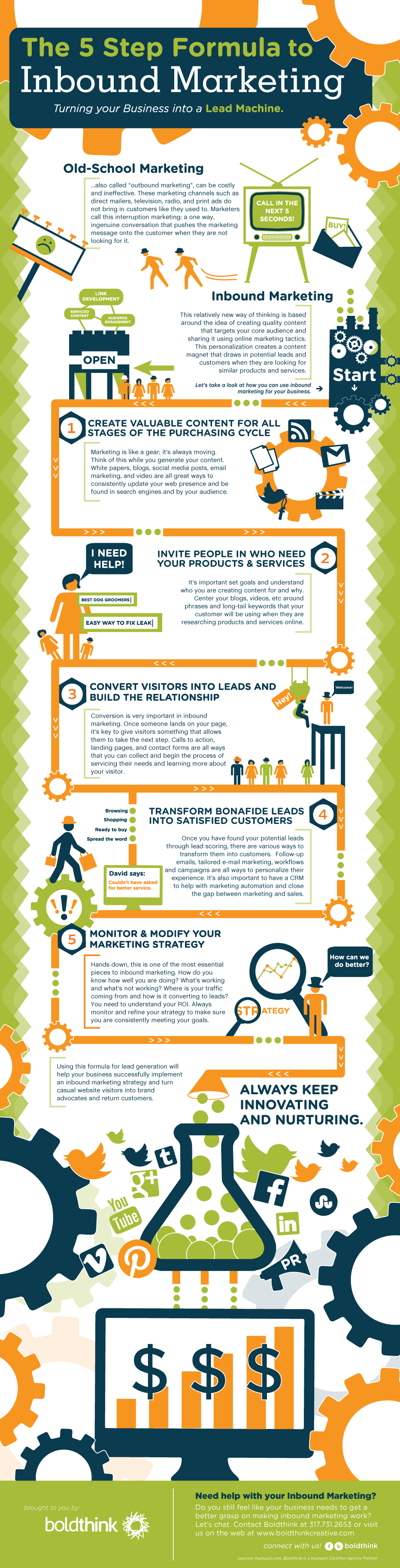และด้วยความนิยมที่เพิ่มสูงขึ้นนี้เองเว็บไซต์ Boldthinkcreative.com จึงได้รวมรวบวีธีในการทำ Inbound Marketing รวม 5 ขั้นตอน เพื่อเป็นแนวทางในการทำการตลาดให้มีความสมบูรณ์ยิ่งขึ้น