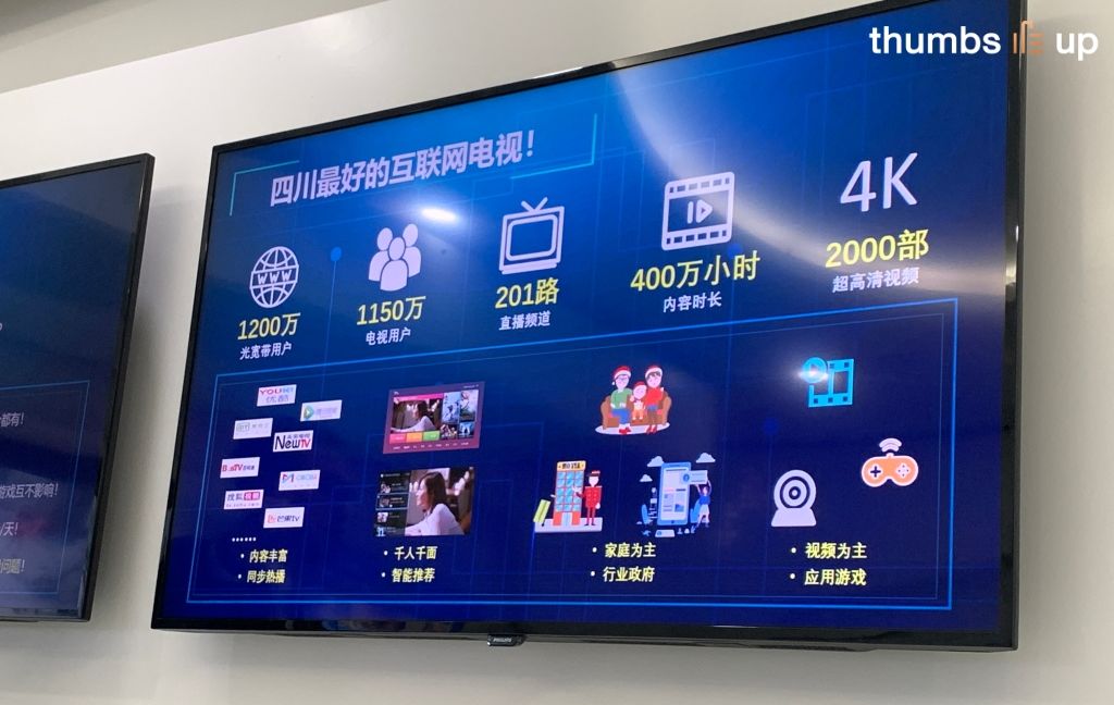 ด้านเอนเตอร์เทนเม้นท์นั้น ในเฉิงตูมีผู้ใช้งานแอพพลิเคชั่นของไชน่าโมบายเพื่อดูทีวีกว่า 12 ล้าน Subscriber เป็นกลุ่มคนที่ดูทีวีกว่า 1,150,000 ครอบครัว เป็นการดูผ่านจอทีวี 201,000 เครื่อง ดูผ่านระบบ 4K มากถึง 2,000,000 คน และมีรีโมทที่สามารถสั่งงานด้วยเสียงและภาพแบบเปลี่ยนช่องตามการใช้งานได้ทันที รองรับสำเนียงภาษาจีนแมนดาริน จีนเสฉวนและภาษาอังกฤษได้ ไม่ว่าคุณจะเป็นใคร สำเนียงแบบไหนก็ตาม