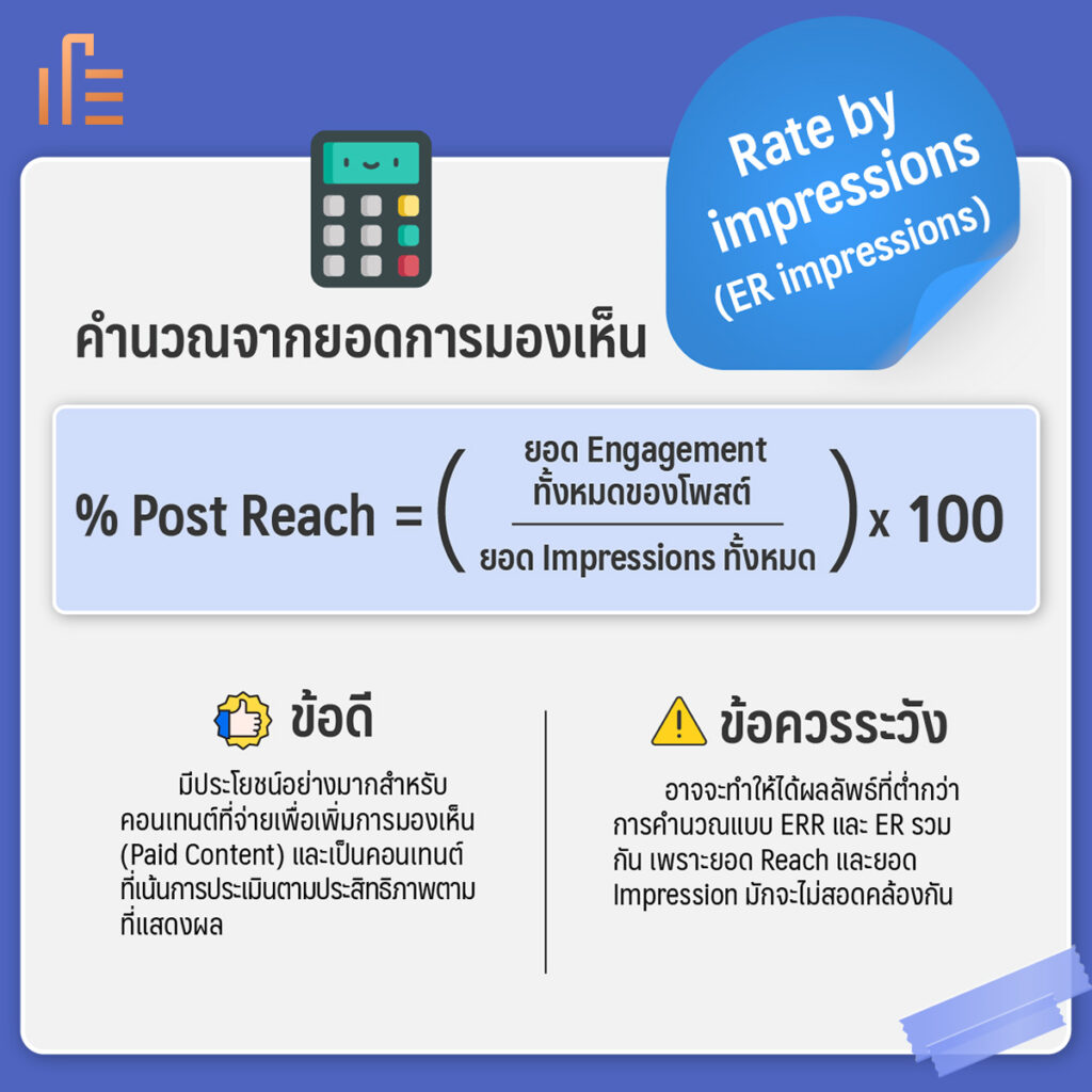 - ข้อเสีย : แม้สูตรนี้จะเป็นสูตรยืนพื้นที่ในการวัดผล Impression แต่อาจจะทำให้ได้ผลลัพท์ที่ต่ำกว่าการคำนวณแบบ ERR และ ER รวมกัน เพราะยอด Reach และ Impression มักจะไม่สอดคล้องกัน