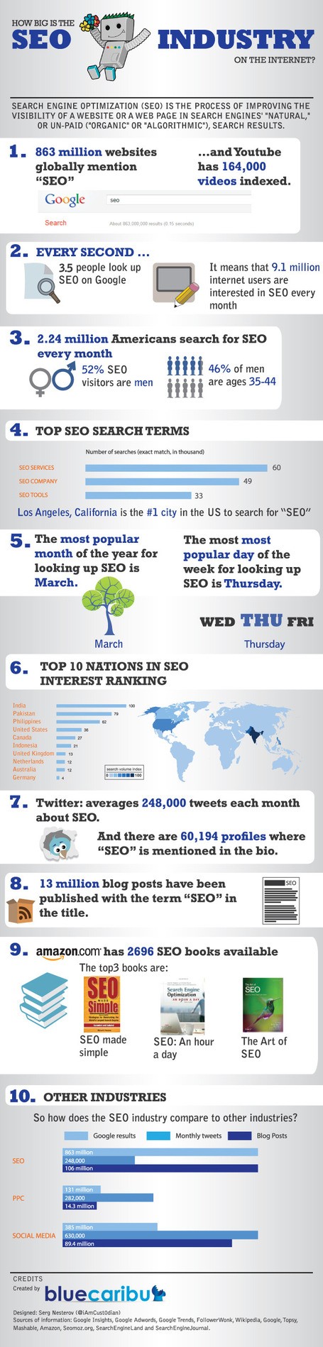 นี่เป็นเพียง 6 จาก 10 สถิติที่ Bluecaribu.com รวบรวมไว้เท่านั้น ผู้สนใจสามารถชม Infographic ฉบับเต็มได้ด้านล่าง ซึ่งจะสามารถอธิบายได้ว่าคนทั่วโลกเห็นด้วยเรื่องการใช้ SEO เป็นตัวช่วยเพิ่มช่องทางในการเข้าถึงแบรนด์และยังส่งผลไปถึงยอดขายที่จะเพิ่มขึ้นตามมา