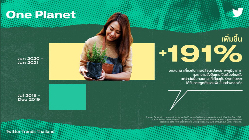 เทรนด์บทสนทนาที่มีการเติบโตรวดเร็วที่สุดบนทวิตเตอร์ประเทศไทย สูงถึง 191% เนื่องจากบทสนทนาที่เกี่ยวกับสิ่งแวดล้อมและความยั่งยืนกลายเป็นเรื่องที่อยู่ในกระแสหลัก คนไทยเริ่มใส่ใจ ขวนขวายหาข้อมูลเกี่ยวกับเรื่องเหล่านี้มากขึ้น เช่น เรื่องภาวะโลกร้อน และความปลอดภัยของสิ่งมีชีวิตในมหาสมุทร