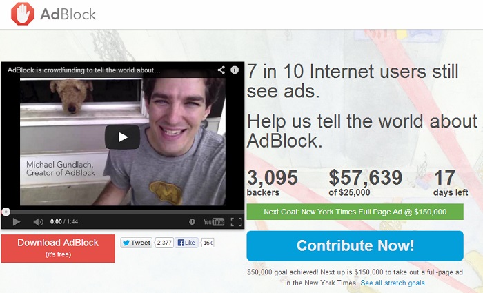 ทั้งที่ได้ชื่อว่าเป็นเครื่องมือเพื่อสร้างสังคมอินเทอร์เนตที่ปลอดโฆษณา แต่ AdBlock กลับสามารถระดมทุน 55,000 เหรียญสหรัฐฯ เพื่อทำแคมเปญโฆษณาของตัวเองได้สำเร็จ งานนี้เรียกว่าเป็นกรณีศึกษาตลกร้ายที่เสี่ยงต่อการทำลายอุดมการณ์ของตัวเองแบบน่าเห็นใจทีเดียว