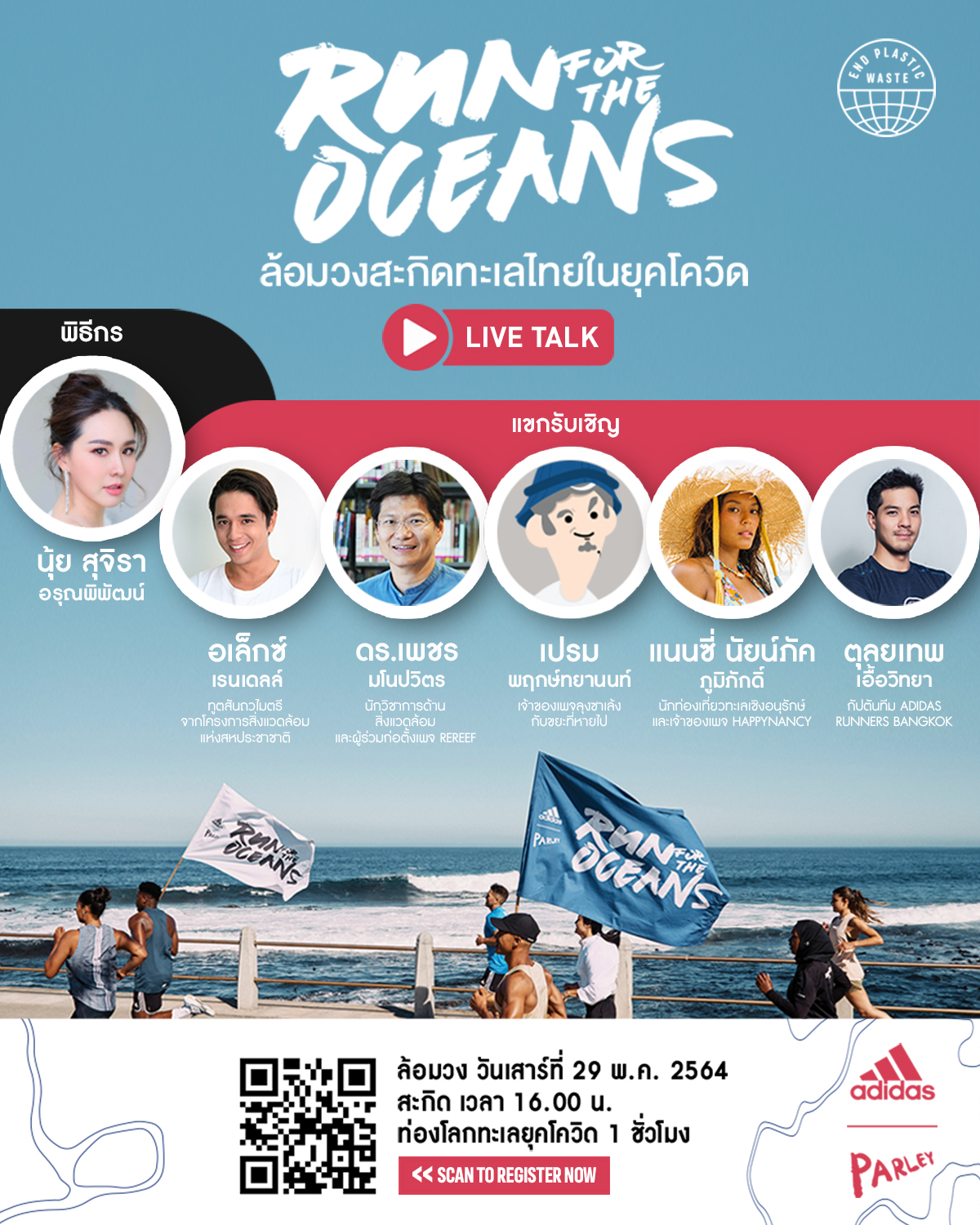 ครั้งแรกของอาดิดาส (ประเทศไทย) กับการจัดกิจกรรมทางออนไลน์ Run For The Oceans “ล้อมวงสะกิดทะเลไทยในยุคโควิด” ที่เปิดโอกาสให้ทุกคนได้ร่วมตระหนักถึงปัญหาและผลกระทบที่เกิดขึ้นจากขยะพลาสติกในท้องทะเล ความเปลี่ยนแปลงของทะเลในช่วงโควิด-19 รวมถึงเทคโนโลยีและกิจกรรมของอาดิดาสที่จะมาช่วยปกป้องมหาสมุทรอย่างยั่งยืน พร้อมเปิดโอกาสให้ผู้ชมทางบ้านได้มีส่วนร่วมและแลกเปลี่ยนความคิดเห็นไปด้วยกันกับผู้รักสิ่งแวดล้อมตัวจริง