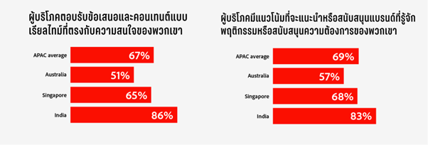 ผู้บริโภคใน APAC หนึ่งในสี่ (75%) คาดหวังว่าจะได้รับประสบการณ์แบบเฉพาะบุคคลจากแบรนด์ที่ตนเองเปิดเผยข้อมูลให้ และมากกว่าสองในสาม (67%) ต้องการข้อเสนอแบบเรียลไทม์ที่เกี่ยวข้องกับตนเองโดยเฉพาะ