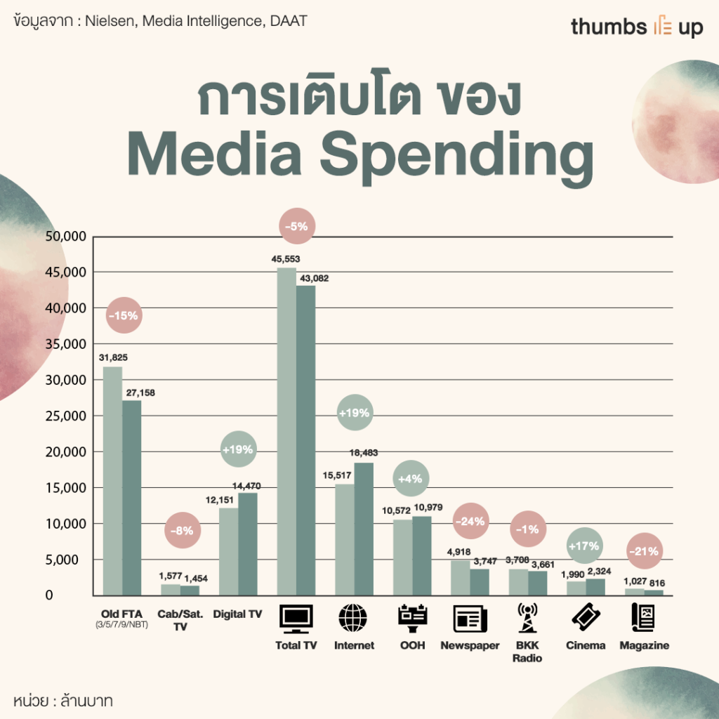 การใช้จ่ายของแบรนด์ในการเลือกลงโฆษณาในสื่อต่างๆ นั้นเรียกได้ว่าอินเทอร์เน็ต เป็นสื่อที่มีตัวเลขบวกมากที่สุดเป็นอันดับหนึ่งคือบวก 19% ตามมาด้วยดิจิทัลทีวี ภาพยนตร์แและสื่อนอกบ้าน ที่มีตัวเลขบวกตามลำดับ ส่วนสื่อที่ติดลบมากที่สุดคงหนีไม่พ้นสื่อหนังสือพิมพ์ที่ผู้เล่นในตลาดลดลงไปเรื่อยๆ และตัวเลขยังคงติดลบมากถึง 24%
