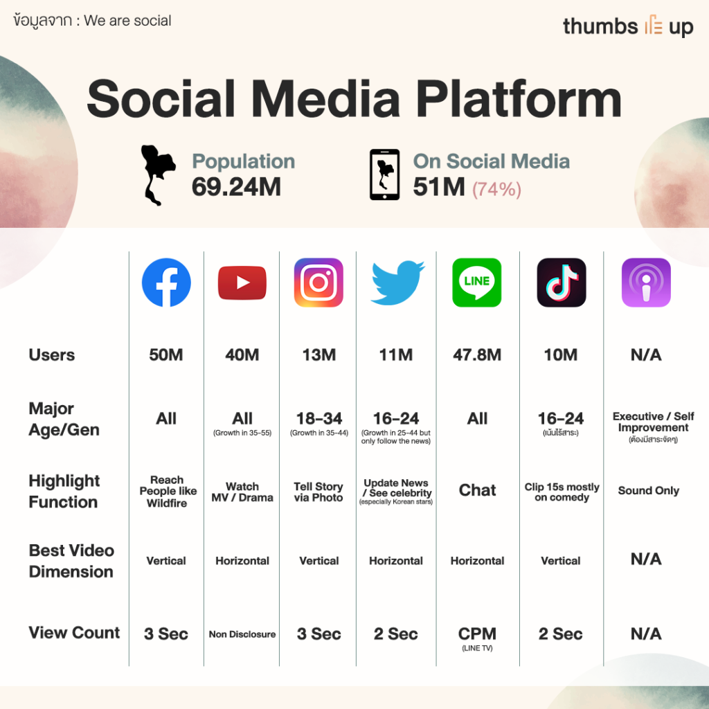 ส่วนการเติบโตของโซเชียลมีเดียนั้น เรียกได้ว่า facebook ยังคงครองตลาด เพราะมีฐานผู้ใช้งานสูงที่สุดถึง 50 ล้านยูสเซอร์ ส่วนแอพพลิเคชั่นที่น่าจับตามองมากที่สุดคือ tik-tok ที่นักการตลาดยังไม่สามารถอ่านเกมออกว่าจะขายโฆษณาในรูปแบบใดบ้าง แต่ฐานผู้เล่นก็แตะ 10 ล้านยูสเซอร์แล้ว หลังเปิดให้บริการในไทยเพียง 1-2 ปี ซึ่งตัวเลขนั้นเรียกได้ว่าตาม twitter มาติดๆ เลยทีเดียว ด้านม้ามืดในตลาดโซเชียลอีกรายอย่าง Podcast ที่ยังไม่มีการเก็บตัวเลขผู้ใช้งานอย่างจริงจังและยังเจาะฐานผู้ใช้งานเป็นเพียงผู้ใช้งานบางกลุ่ม (niche market) เท่านั้น แต่นักการตลาดก็วิเคราะห์ว่าจะมีการขายโฆษณาแบบยกแพค (หรือแถมพ่วง) ให้แก่แบรนด์ที่ต้องการสร้างชื่อเสียงหรือตอกย้ำความน่าเชื่อถือ ให้กับกลุ่มคนฟังที่มีวุฒิภาวะ และเป็นกลุ่มคนที่ฟังเพื่อสะสมความรู้แลกเปลี่ยนความคิดเห็น ให้แก่คนที่รู้น้อยกว่า