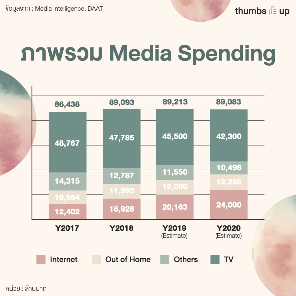 หากดูจากตัวเลขรวมของอุตสาหกรรมสื่อโฆษณานั้น ต้องเรียกว่าภาพรวมดูจะไม่มีโอกาสแตะหลักแสนล้านได้แบบเมื่อปี 2012-2016 อีกแล้ว โดยเมื่อย้อนกลับไปในภาพรวมปี 2012 นั้น จะพบว่า มีตัวเลขแตะ 115,367 ล้านบาทและเพิ่มขึ้น 4.5% เป็น 120,570 ล้านบาท ก่อนจะลดลงมาเรื่อยๆ เหลือ 114,497 – 100,352 ล้านบาท จนตกต่ำสุดในปี 2017 ที่เหลือเพียง 86,438 ล้านบาท และยังคงลดลงมาต่อเนื่อง และมีการคาดการณ์ว่าจบปี 2019 จะแตะ 89,213 ล้านบาท ยังลดลงไม่สาแก่ใจเมื่อปี 2020 คาดว่าตัวเลขจะลดลงเหลือ 89,083 ล้านบาทเท่านั้น