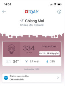 โดยจังหวัดที่หนักที่สุดคือ เชียงใหม่ เว็บไซต์ IQAir รายงานคุณภาพอากาศ พบว่าเชียงใหม่อยู่ในอันดับ 1 ของเมืองที่มีมลพิษมากที่สุดในโลก มีค่าฝุ่น PM 2.5 อยู่ในระดับสีม่วง วัดได้ 334 AQI US ส่งผลกระทบต่อทุกคน