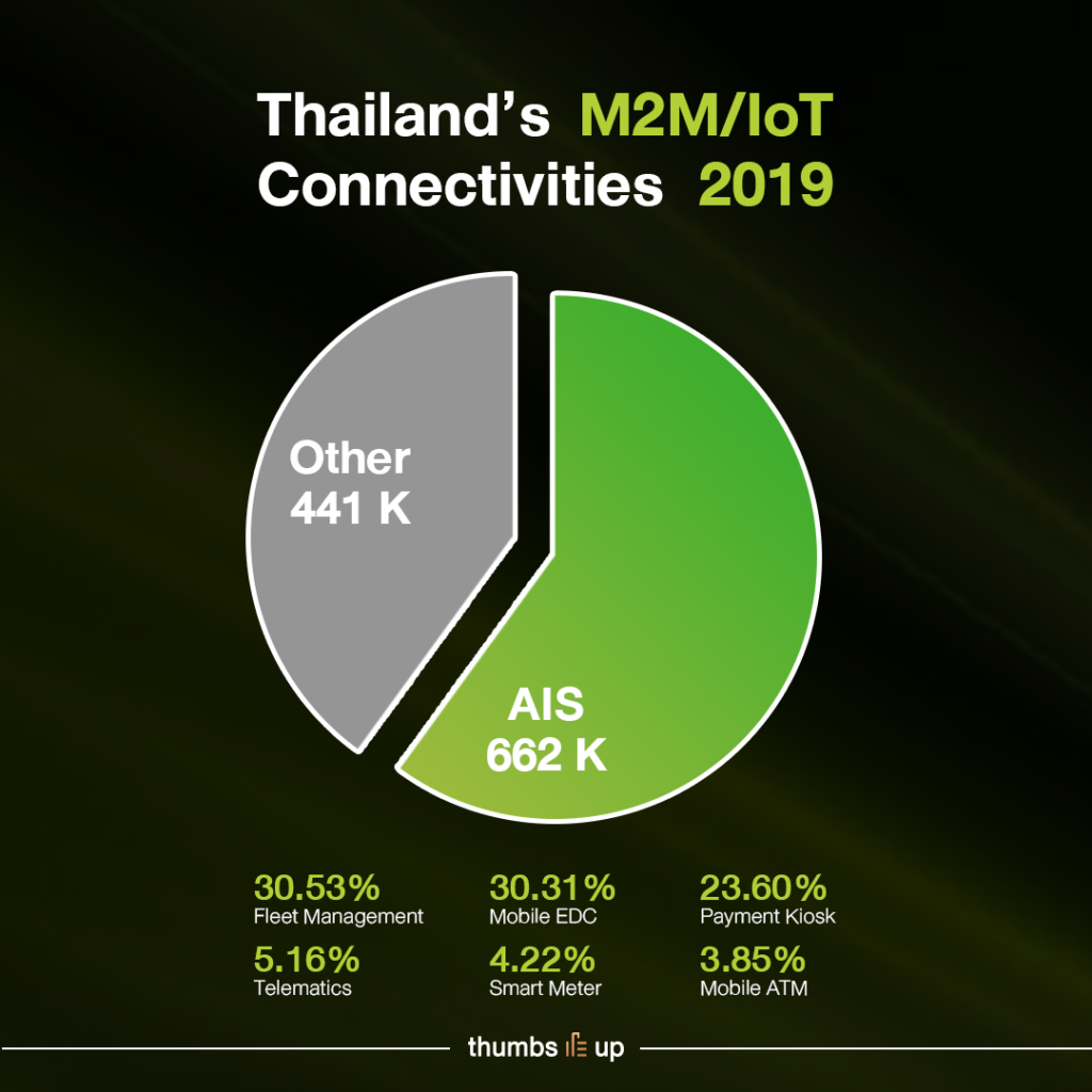ด้าน คุณนวชัย เกียรติก่อเกื้อ หัวหน้าแผนกงานการตลาดกลุ่มลูกค้าองค์กร เอไอเอส กล่าวว่า ตลาด IoT ในไทย มีจำนวนอุปกรณ์เชื่อมต่อรวมกันกว่า 1.1 ล้านชิ้น แบ่งเป็นของเอไอเอส 6.62 แสนชิ้น ที่เหลือเป็นของรายอื่นๆ อีก 4.41 แสนชิ้น รูปแบบของการนำไปใช้งานส่วนใหญ่ยังคงเป็นด้าน Fleet Management หรือการติดตามสิ่งเคลื่อนไหว มีสัดส่วนอยู่ที่ 30.53% ตามมาด้วย Mobile EDC อยู่ที่ 30.31% Payment Kiosk 23.60% Telematics 5.16% Smart Meter 4.22% และ Mobile ATM 3.85%
