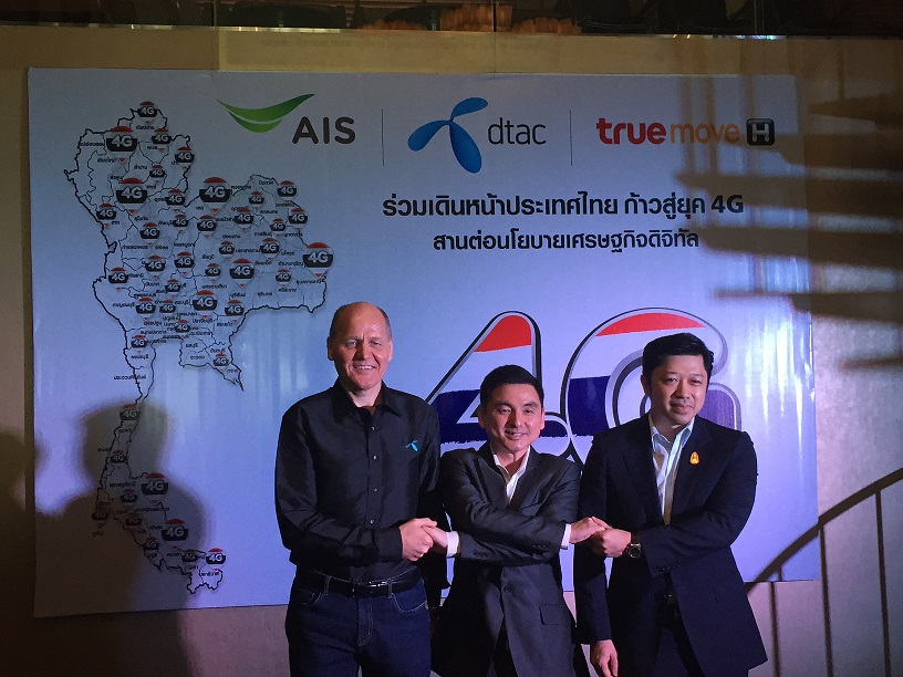 3 ผู้ให้บริการรายใหญ่ในประเทศไทย AIS, dtac และ TrueMove H ร่วมกันแถลงข่าวเพื่อสนับสนุนและแสดงความพร้อมในการเข้าร่วมประมูลคลื่น 4G ในปี 2558 ตอบสนองต่อนโยบายของรัฐบาลที่กำลังจะก้าวเข้าสู่ยุคเศรษฐกิจดิจิทัล หรือ Digital Economy