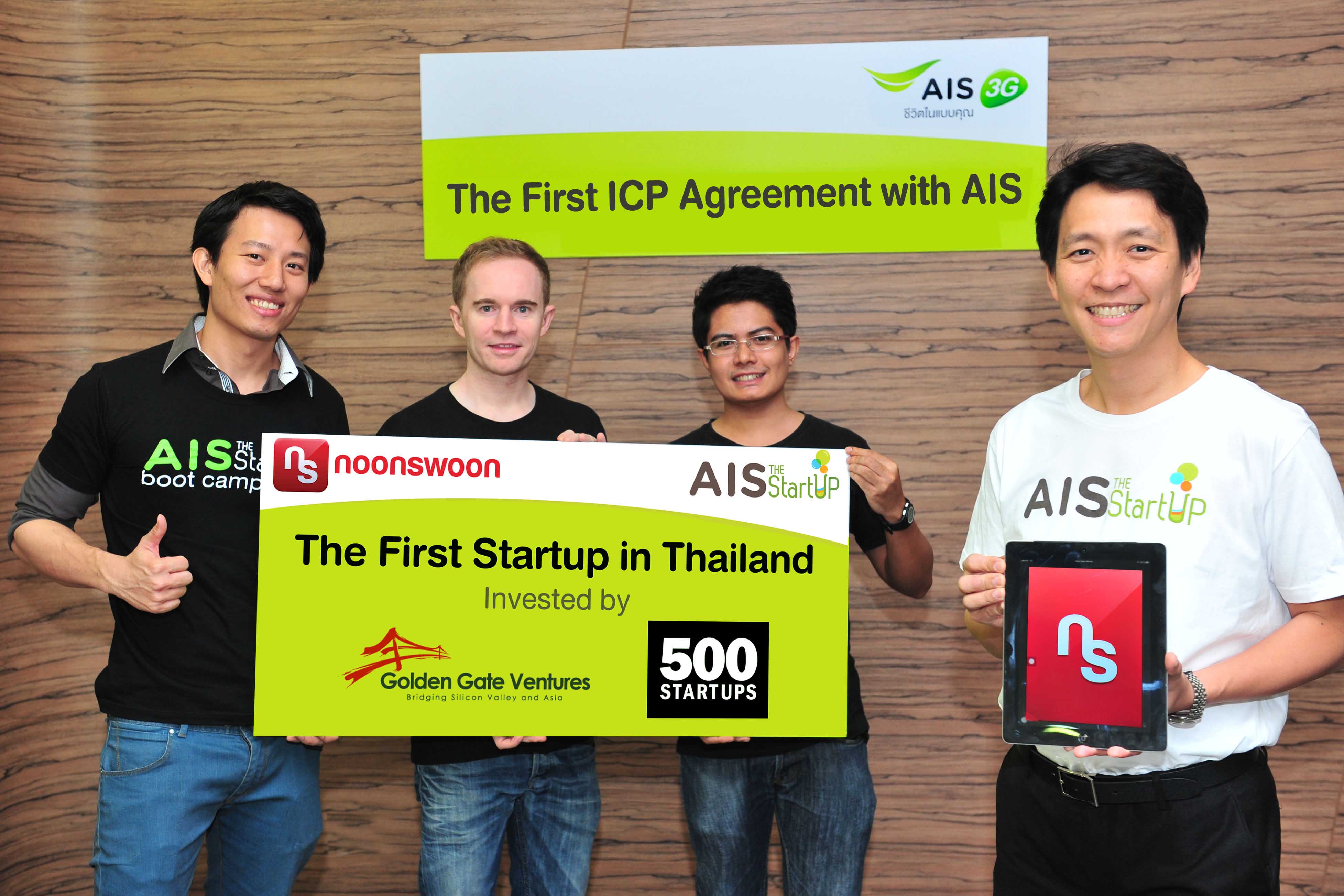 พร้อมกันนี้ เอไอเอสยังร่วมเป็น Back up ผลักดัน Noonswoon สู่เวทีนักลงทุนระดับโลกมาโดยตลอดด้วยศักยภาพของ Noonswoon ที่พร้อมต่อการเติบโตทางธุรกิจในอนาคต ทำให้ได้รับความสนใจจากนักลงทุนทั้งไทยและต่างชาติเป็นจำนวนมาก จนกระทั่งขณะนี้ Noonswoon ได้รับการลงทุน นำโดย Golden Gate Venture และ 500 Startups กลุ่มนักลงทุนชื่อดังจาก Silicon Valley และผู้ร่วมทุนรายอื่นๆ อีก เหล่านี้ จึงนับเป็นเป็นความสำเร็จอย่างเป็นรูปธรรมก้าวแรกของทีม Noonswoon ที่เอไอเอสตั้งใจสร้างโอกาสทางธุรกิจที่ยั่งยืนให้กับกลุ่ม Startup พร้อมเติบโตไปด้วยกันอย่างแข็งแรง” นายปรัธนากล่าว
