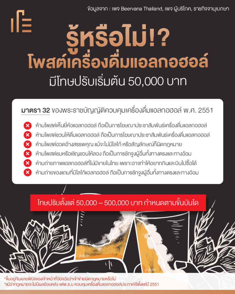 รู้หรือไม่ โพสต์เครื่องดื่มแอลกอฮอล์มีโทษปรับเริ่มต้น 50,000 บาท ตามมาตรา 32 ของพระราชบัญญัติควบคุมเครื่องดื่มแอลกอฮอล์ พ.ศ. 2551