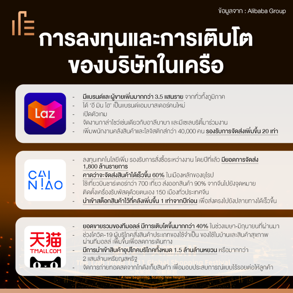 ทางด้านบริษัทในเครืออาลีบาบา ไม่ว่าจะเป็น ลาซาด้า ไช่เหนียว ทีมอลล์และเถาเป่า มีการเติบโตอย่างก้าวกระโดดในช่วงมหกรรม เพราะอีโคซิสเต็มส์ทุกอย่างช่วยส่งเสริมโอกาสทางการขายไปยังทั่วโลก