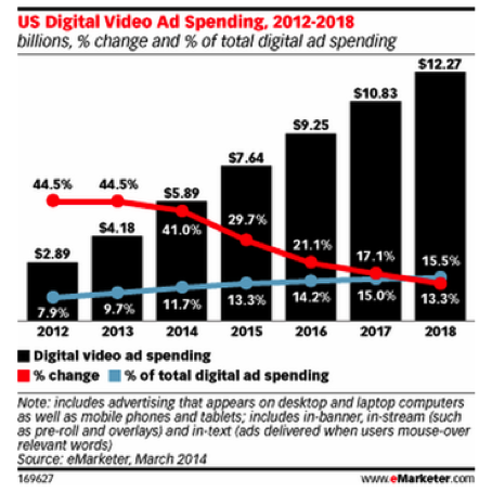 ตามที่ eMarketer บริษัทวิจัยตลาดในโลกดิจิทัลพยากรณ์ว่า ในอเมริกาจะมีเม็ดเงินลงโฆษณาทางวิดีโอที่เพิ่มขึ้นไปตลอดจนถึงปี 2018