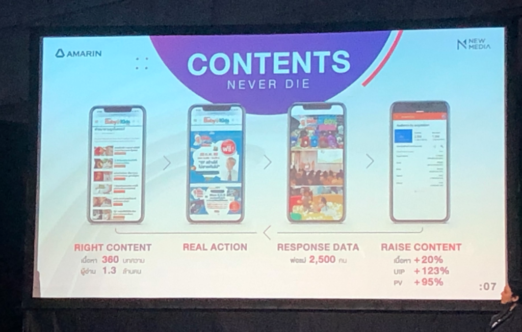 ยกตัวอย่าง : คอนเทนต์ของ Amarin Baby & Kids ที่ให้ความรู้ด้านแม่และเด็ก ซึ่งสามารถนำมาต่อยอดจัดกิจกรรมจริงได้เป็นงานสินค้าแม่และเด็กขนาดใหญ่ Amarin Baby & Kids Fair ที่เมื่อจัดงานแล้วสามารถเก็บข้อมูลจากผู้เข้าร่วมงานมากมาย ซึ่งเป็นคุณพ่อคุณแม่ตัวจริง และทำให้ต่อยอดคอนเทนต์ไปได้จากการนำความสนใจ หรือคำถาม ที่คุณพ่อคุณแม่สนใจมาสร้างเป็นคอนเทนต์ใหม่ๆ ต่อไป