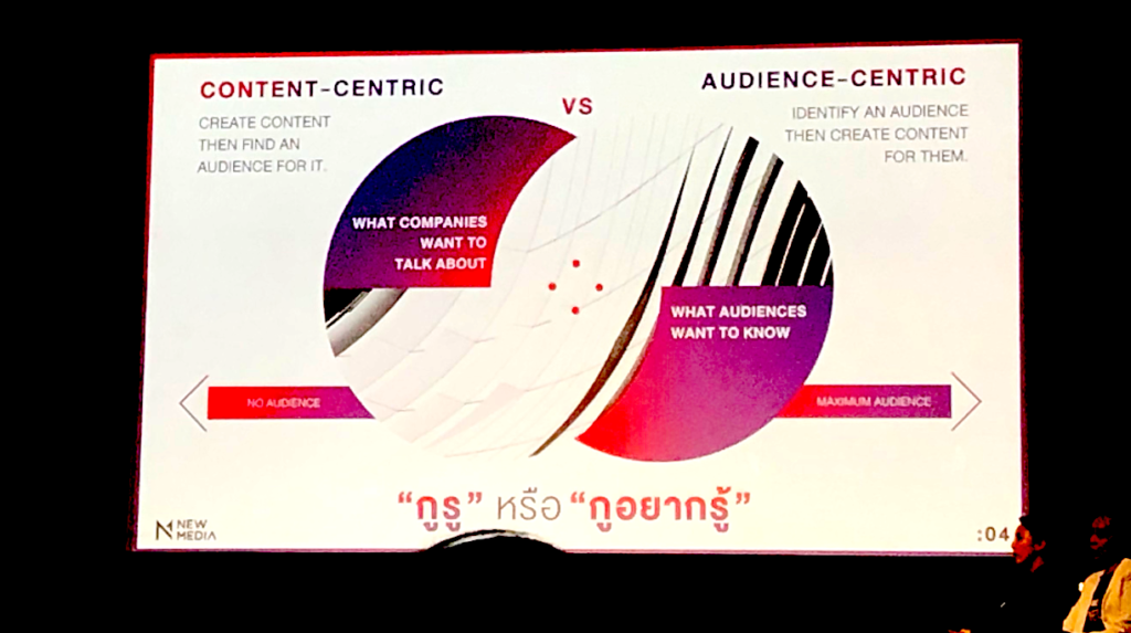 • กูรู หรือหลักการทำแบบ ‘Content-Centric’ ว่าเราอยากส่งสิ่งให้ชาวโลก ส่วนใหญ่คนทำคอนเทนต์มักคิดว่า “ฉันจะทำคอนเทนต์อะไรดี” หรือ “เรามีความเก่งที่จะทำคอนเทนต์อะไร” ข้อเสียของการเล่าเรื่องด้วยวิธีนี้ เราต้องไปตามหาว่าใครอยากฟังในสิ่งที่เราอยากเล่า