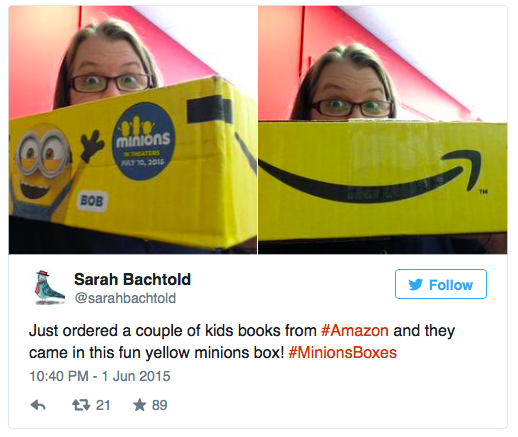 ข้อมูลระบุว่า Amazon เริ่มจัดส่งสินค้าด้วยกล่องสีเหลืองที่มีภาพน่ารักของเหล่า Minion (มินเนี่ยน) ตั้งแต่สัปดาห์ที่ผ่านมา โดยรูปแบบโฆษณามีความแตกต่างกันไปตามขนาดของกล่องสินค้า จุดนี้คาดว่าลวดลายของโฆษณาใหม่บนกล่องสินค้า Amazon จะมีไม่ต่ำกว่า 3 ลาย