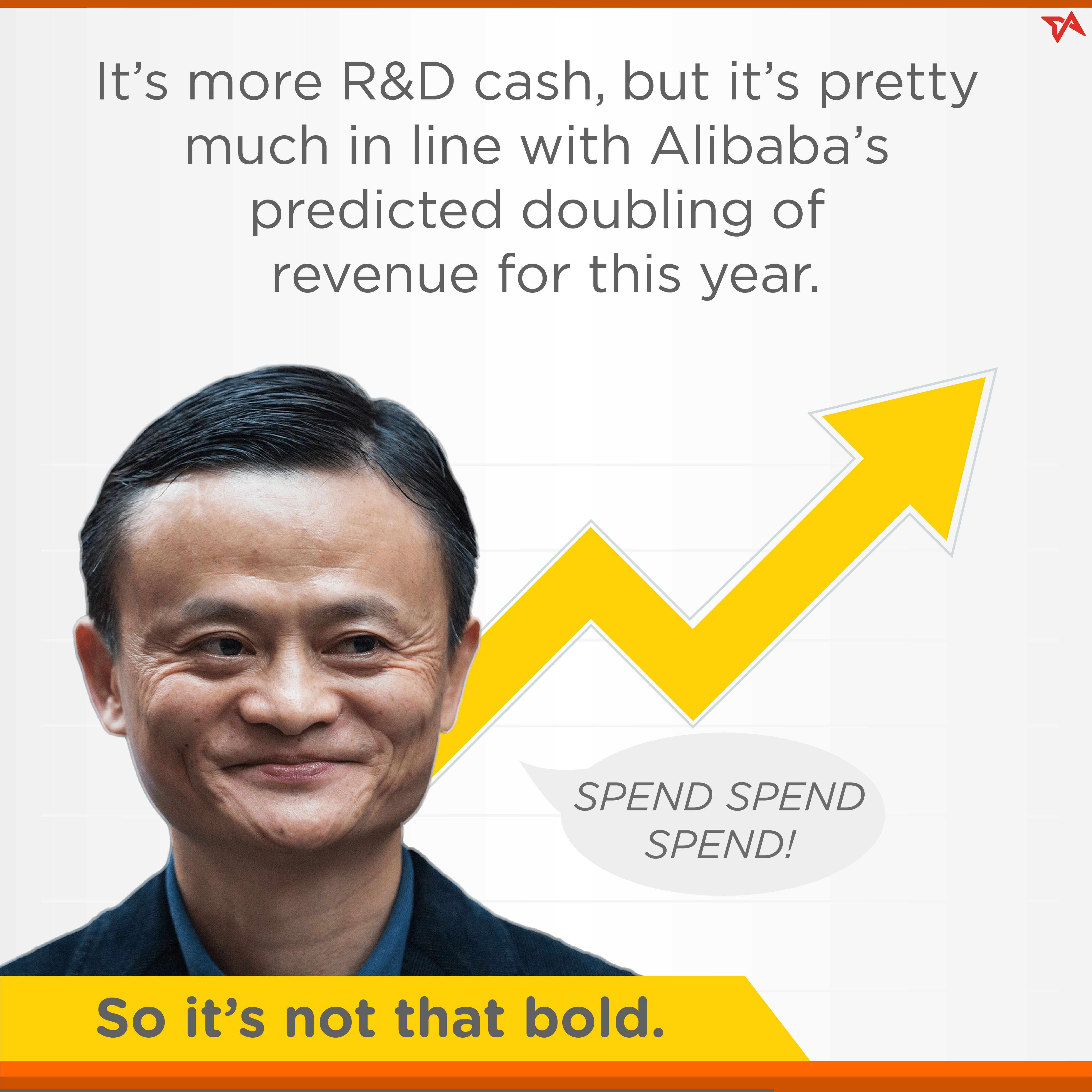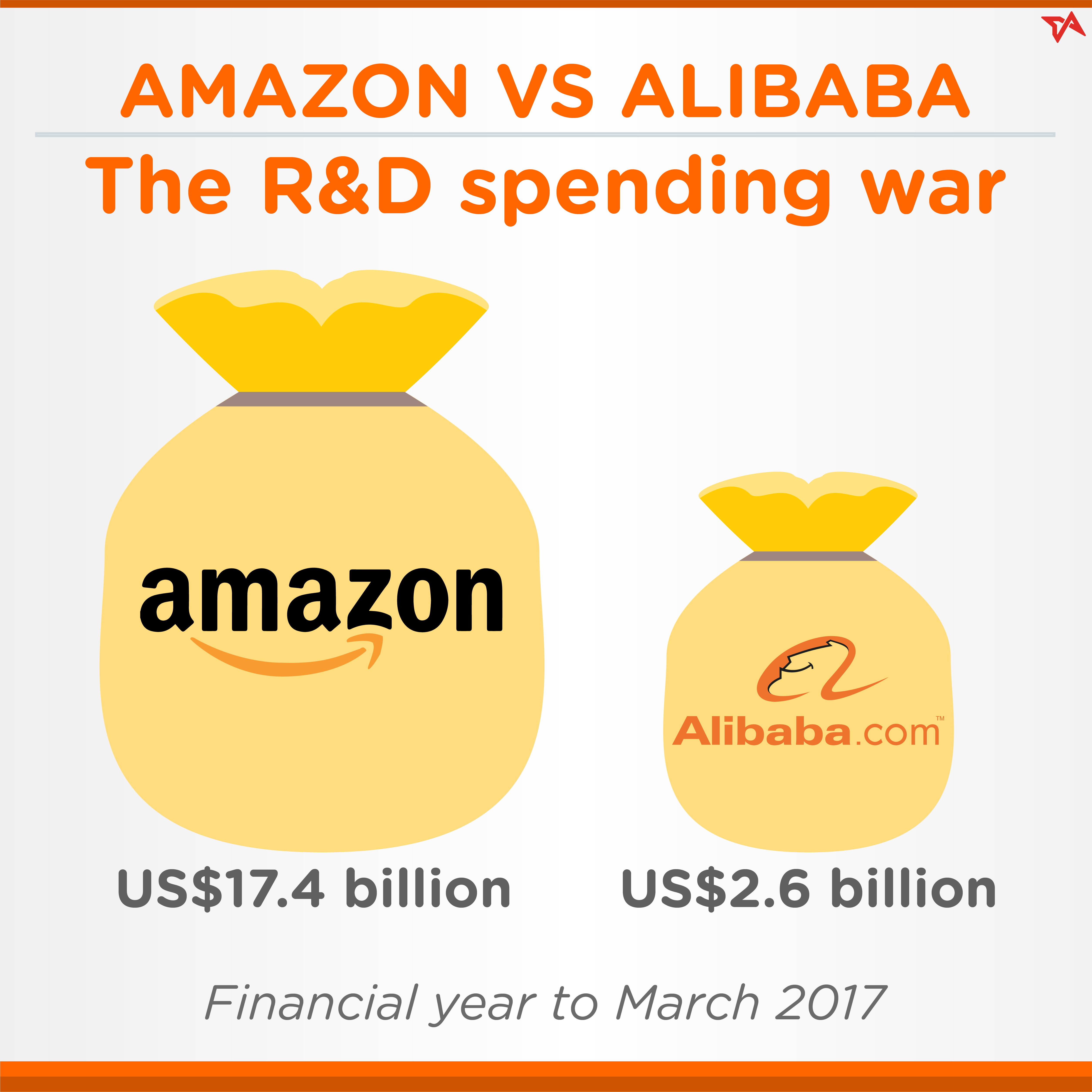 ในภาพรวม Tech in Asia พยายามย้ำว่าเม็ดเงินลงทุนของ Alibaba นั้นไม่ได้หรูหราเมื่อเทียบกับ Amazon เนื่องจากรายหลังมีดีกรีเป็นบริษัทที่เทงบ R&D มากที่สุดในสหรัฐฯ ทำให้เจ้าพ่อเสิร์ชเอนจิ้นอย่าง Google กลายเป็นรองเพราะนั่งเก้าอี้ใช้เงิน R&D อันดับ 2 ของแดนลุงแซม