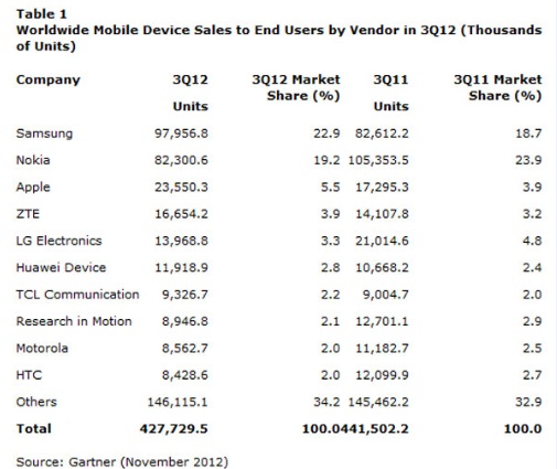 นอกจากนี้ Gartner ยังสำรวจยอดขายโทรศัพท์มือถือแยกตามยี่ห้อผู้ผลิด พบว่า Samsung นำโด่งมาเป็นอันดับหนึ่ง โดยกินส่วนแบ่งทางการตลาดอยู่ที่ 22.9% จากเดิมทำได้ที่ 18.7% ถัดมาเป็น Nokia ที่ถึงแม้จะมีโทรศัพท์รุ่น Asha มาช่วย แต่ก็ทำได้เพียง 19.2% ในปีนี้ ลดลงจากปีที่แล้วที่ทำไว้ 23.9% และอันดับที่สามก็คือ Apple ที่ได้ส่วนแบ่งฯ เพิ่มจาก 3.9% มาเป็น 5.5% ในปีนี้