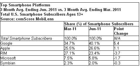 ในปัจจุบัน Android อยู่อันดับ 1? ตามมาด้วย iOS ของ Apple ที่มีส่วนแบ่ง 26.6% เติบโตจากเดือนมีนาคม 1.1% ในขณะที่? RIM มีส่วนแบ่ง 23.4% , Microsoft 5.8%, และ Symbian 2%? และสามรายหลังนี้เสียส่วนแบ่งตลาดลงไปเรื่อยๆ
