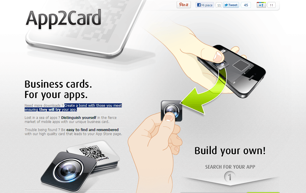 บริการนี้เอาใจนักพัฒนา App ทั้งหลายกันเลยทีเดียวค่ะ ปกติเวลาจะแนะนำตัวกันก็มักจะยื่นนามบัตรชื่อตัวเองให้ แต่แหม..พัฒนา App กันทั้งทีขอใช้นามบัตรแบบเก๋ๆ โปรโมต App หน่อยเถอะ App2Card คือบริการที่จะทำให้ผู้ที่รับนามบัตรพิเศษนี้ไปอย่างน้อยๆ น่าจะจดจำ App เราได้เพิ่มขึ้น เพราะนามบัตรพิเศษนี้จะทำออกมาในรูปทรงของ App icon และด้านหลังก็จะใส่ QR Code และ shortened URL ให้คนที่รับบัตรไปดาวน์โหลด App จาก Appstore กันได้สะดวกๆ และถ้าอยากรู้ว่ามีคนมาโหลด App จากนามบัตรที่ได้ไปเยอะแค่ไหนก็ดูได้ไม่ยากค่ะ เพราะ shortened URL เค้าใช้ bit.ly เอามา track ดูได้อย่างสบายๆ เปลี่ยนนามบัตรกลายเป็นเครื่องมือการตลาดขนาดย่อมไปในตัว