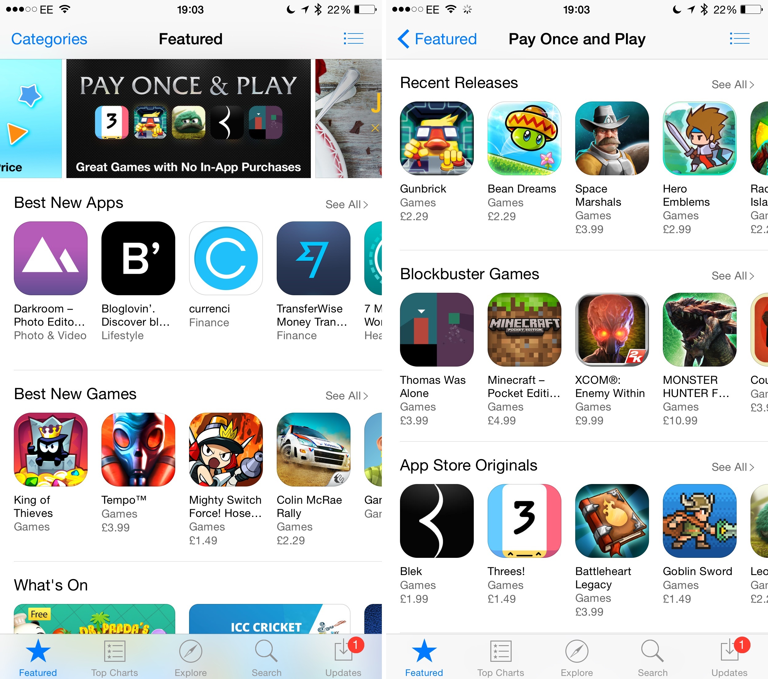รูปแบบการจัดการของ Apple เรียกได้ว่าแก้ไขปัญหาคนที่อยากเล่นเกมแบบเสียเงินทีเดียวจบได้ดีทีเดียว โดยรวมเกมที่เสียเงินแต่ไม่ต้องมีการซื้ออะไรเพิ่มเติมในหน้าเดียวกันด้วยการใช้ชื่อบน App Store Section ว่า “Great Games with No In-App Purchases” หรือเกมเจ๋งๆ ที่ไม่มี IAP หรือไม่ต้องจ่ายเงินเพิ่มอีกแล้วหลังจากกดซื้อครั้งแรก ซึ่งก็ช่วยให้เกมที่มีการจ่ายเงินทีเดียวถูกรวบรวมให้เราเลือกซื้อได้ง่ายขึ้น แยกจากเกมที่มาในรูปแบบ Free แล้วกินกันระยะยาว