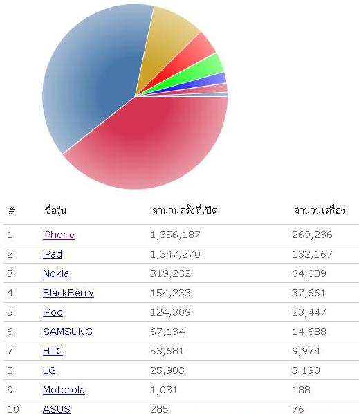 Mobilethai.net รายงานว่าคนไทยใช้สมาร์ทโฟนหรือสมาร์ทดีไวซ์ยี่ห้อไหนในการบราวซ์อินเทอร์เน็ตมากที่สุดพบว่าเป็น iPhone สูงถึง 269,236 เครื่อง ตามมาด้วย iPad 132,167 เครื่อง ตามมาด้วย Nokia 64,089 เครื่อง BlackBerry 37,661 เครื่อง และ iPod จาก Apple 23,447