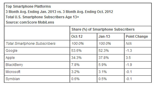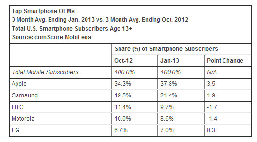 เรื่องนี้ถือเป็นข่าวดีของ Apple แม้จะพบกับวิกฤตศรัทธาจากนักลงทุนและผลกำไรที่ลดลง แต่ผู้บริหาร Apple ก็ยังพอมีเรื่องให้ยิ้มได้ เมื่อรายงานจาก ComScore เผยให้เห็นว่า Apple ยังเป็นผู้ผลิตสมาร์ทโฟนอันดับหนึ่งของอเมริกา ด้วยส่วนแบ่งตลาด 37.8% เพิ่มขึ้นจากการสำรวจครั้งล่าสุดเมื่อเดือนตุลาคม 3.5%