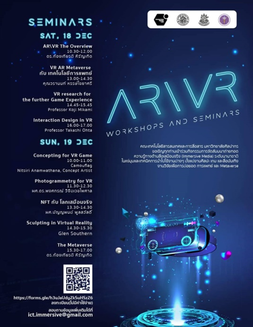 ล่าสุด ARIVR Workshop & Seminars เตรียมสัมมนาออนไลน์กว่า 9 หัวข้อ อัดแน่น 2 วันเต็ม ถ่ายทอดความรู้ทางด้านสื่อเสมือนจริง (Immersive Media) ระดับนานาชาติ ไม่ว่าจะเป็น AR , VR , Metaverse , NFT โดยมีวิทยากรผู้เชี่ยวชาญกว่า 8 ท่าน มาบรรยายและแบ่งปันประสบการณ์ในแง่มุมเทคนิคการนำไปใช้งานต่างๆ ตั้งแต่งานศิลปะ เกม และสื่อบันเทิง รวมถึงงานวิจัยเพื่อการต่อยอด การแพทย์ และ Metaverse ที่พร้อมจะเปิดมุมมองความคิด ให้เกิดการเรียนรู้ และความคิดสร้างสรรค์ในโลกเสมือนจริง ซึ่งจะมีขึ้นในวันเสาร์ที่ 18 และอาทิตย์ที่ 19 ธันวาคม 2021 ผ่านระบบ Zoom Meeting ผู้สนใจลงทะเบียนผ่าน QR Code หรือ Link https://forms.gle/Gt7idusLANbZDBCH9