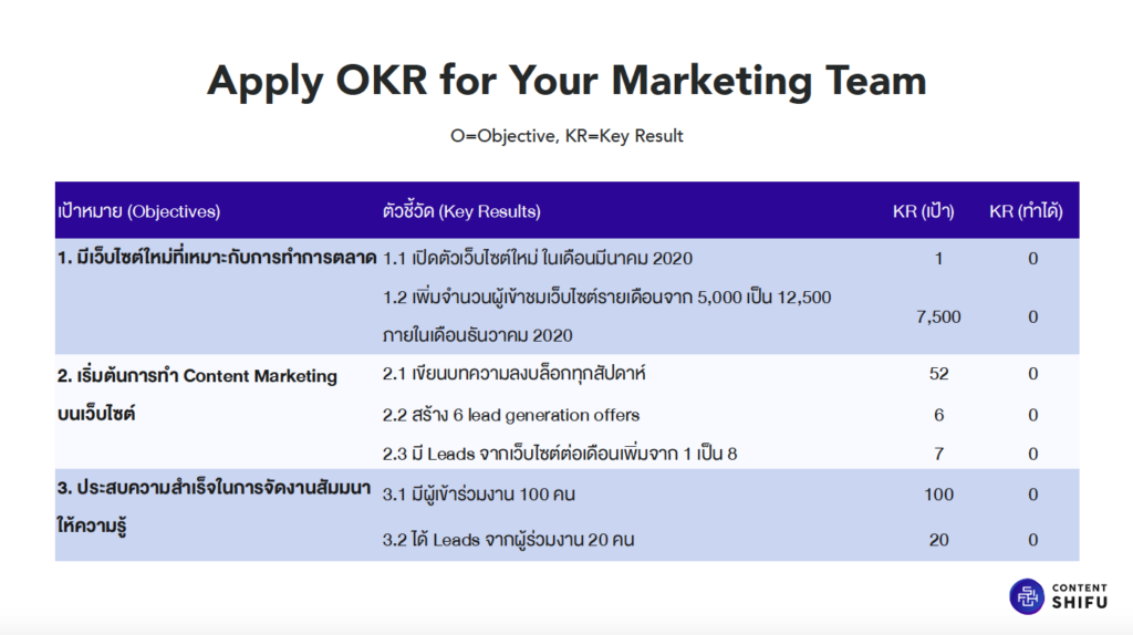รวมถึงยังแนะนำให้เอา OKR มาใช้ในการวางแผนสำหรับทีมการตลาดอีกด้วย ตัวอย่างการวางแผนด้วย OKR เป็นดังภาพด้านล่าง