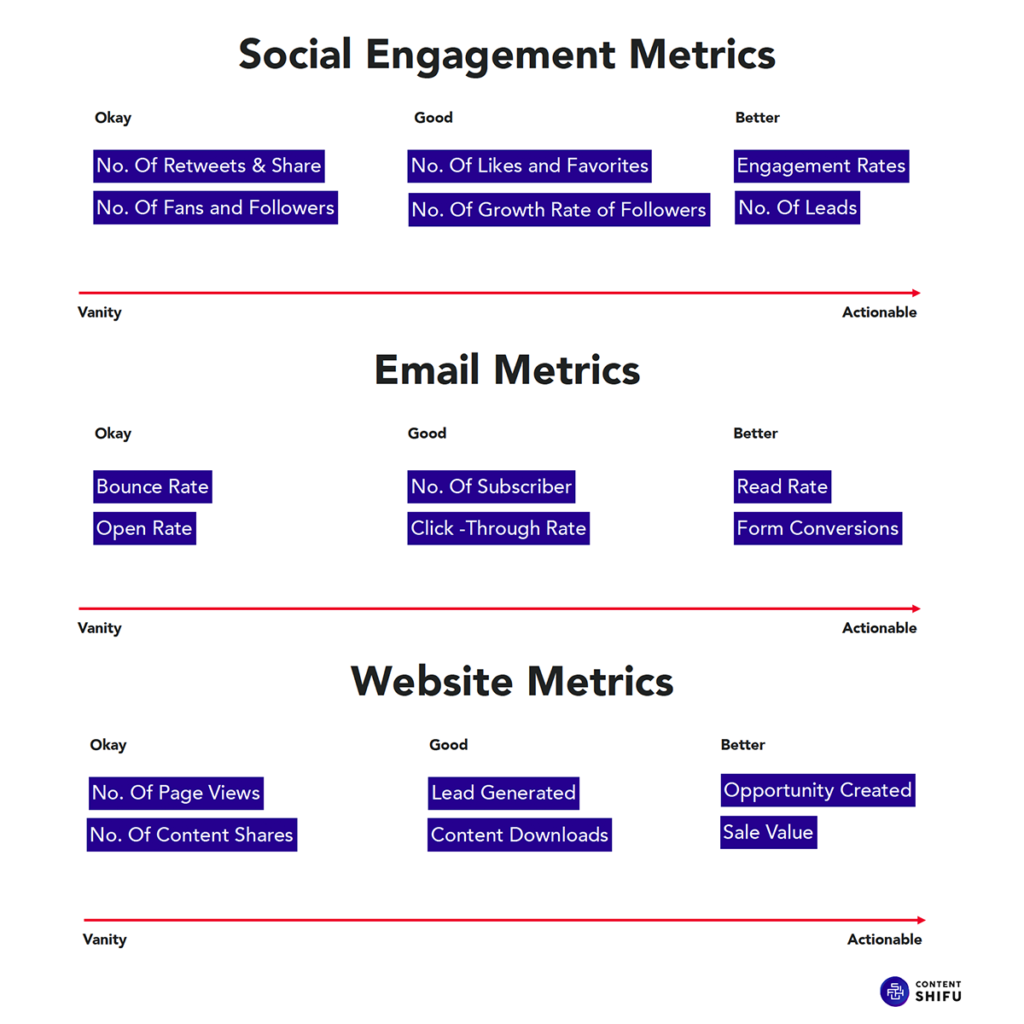 ส่วนในฝั่ง Email Marketing ปกติเราจะดูที่ Bounce rate และ Open rate ถ้าดีขึ้นมาอีกระดับก็คือดูที่ยอดการกด Subscribe อีเมลเพื่อรับข่าว และยอดคลิกเข้าเว็บไซต์ที่มาจากอีเมล (Click-through rate) ถ้าดีที่สุดก็ควรดู คือ ยอดคนอ่านอีเมล (Read rate) และยอดคนที่ดูอีเมลแล้วกดเข้ามากรอกข้อมูลไปจนถึงกดซื้อ (Form conversions)