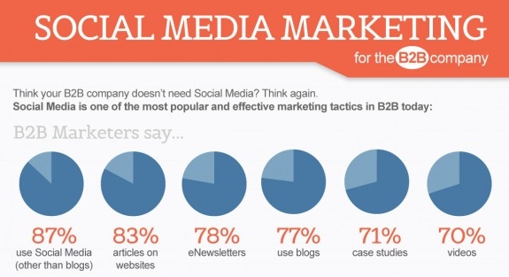 เว็บไซต์ Clearpointagency.com ได้ทำการสำรวจถึงมุมมองของผู้ประกอบการธุรกิจแบบ B2B (Business to Business) ของสหรัฐฯเกี่ยวกับการทำตลาดในปัจจุบันพบว่า รูปแบบการทำการตลาดที่ได้รับความนิยมและประสิทธิภาพสูงสุดในเวลานี้ คือ Social Media Marketing หรือการทำการตลาดบนโซเชียลมีเดียนั่นเอง โดยนักการตลาดในกลุ่ม B2B ระบุว่าโซเชียลมีเดียเป็นช่องทางที่มีการใช้งานสูงสุด ซึ่งมีสัดส่วนอยู่ที่ 87% ส่วนช่องทางอื่นที่ได้รับความนิยมรองลงมาได้แก่ บทความบนเว็บไซต์ มีสัดส่วนราว 83%, E-Newsletters 78%, บล็อก 77%, กรณีศึกษา (Case Study) 71% และวีดีโอ 70%