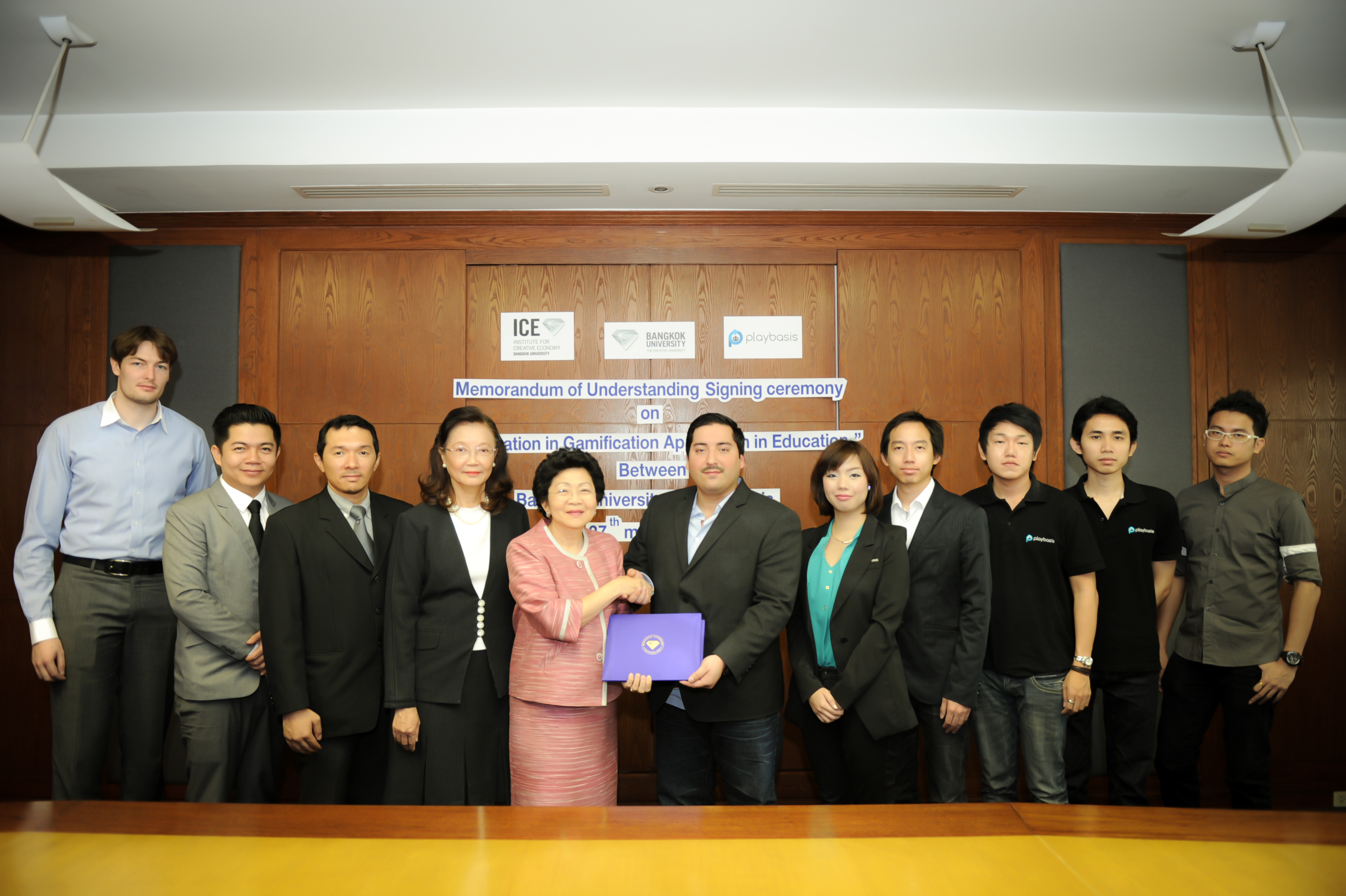 สถาบันเศรษฐกิจสร้างสรรค์ มหาวิทยาลัยกรุงเทพ เป็นสถาบันการศึกษาแห่งแรกที่ร่วมมือกับบริษัท Playbasis จำกัด ลงนามในบันทึกข้อตกลงทดลองนำ Gamification มาใช้ในการเรียนการสอน หวังกระตุ้นการมีส่วนร่วมในการเรียนของนักศึกษาผ่านกระบวนการของเกม โดยมี ดร.มัทนา สานติวัตร อธิการบดี ในนามผู้แทนมหาวิทยาลัยกรุงเทพ และ Robert Zepeda, Founder & CEO ในนามผู้แทน บริษัท Playbasis จำกัด ร่วมลงนามบันทึกข้อตกลง ณ วิทยาเขตกล้วยน้ำไท เมื่อวันที่ 27 มีนาคม 2556