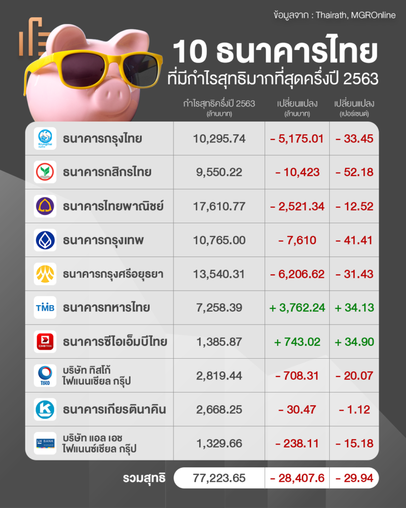 ธนาคารพาณิชย์ 10 แห่ง ได้แจ้งผลประกอบการงวด 6 เดือนแรกของปี 63 มีกำไรสุทธิ 77,223.65 ล้านบาท ปรับตัวลดลง 28,407.6 ล้านบาท จากงวด 6 เดือนแรกของปี 62 มีกำไรสุทธิ 105,631.25 ล้านบาท เป็นผลจากธนาคารพาณิชย์นำเงินไปกันสำรองหนี้เสียเพิ่มขึ้น เพื่อรองรับผลกระทบจากโควิด-19
