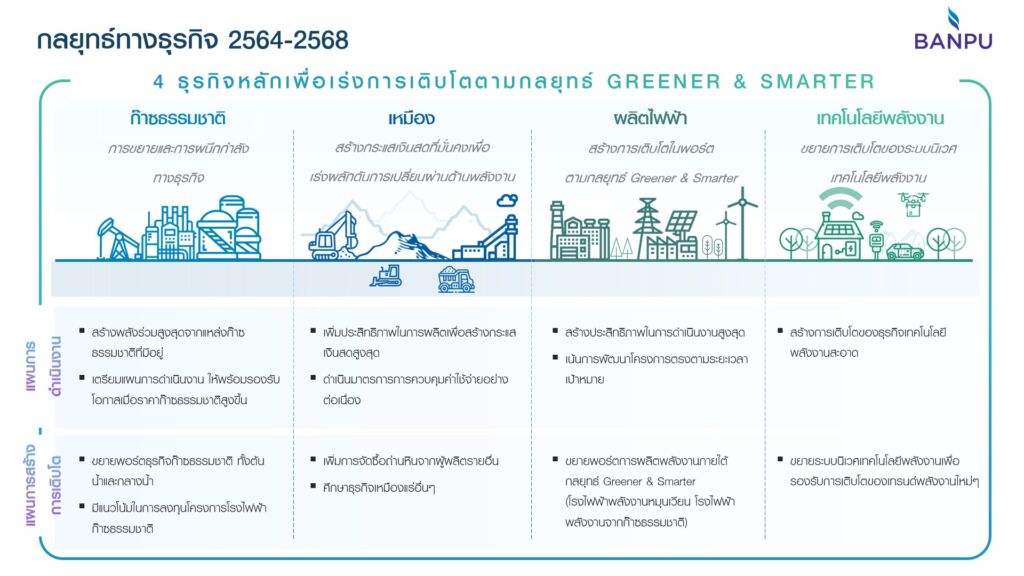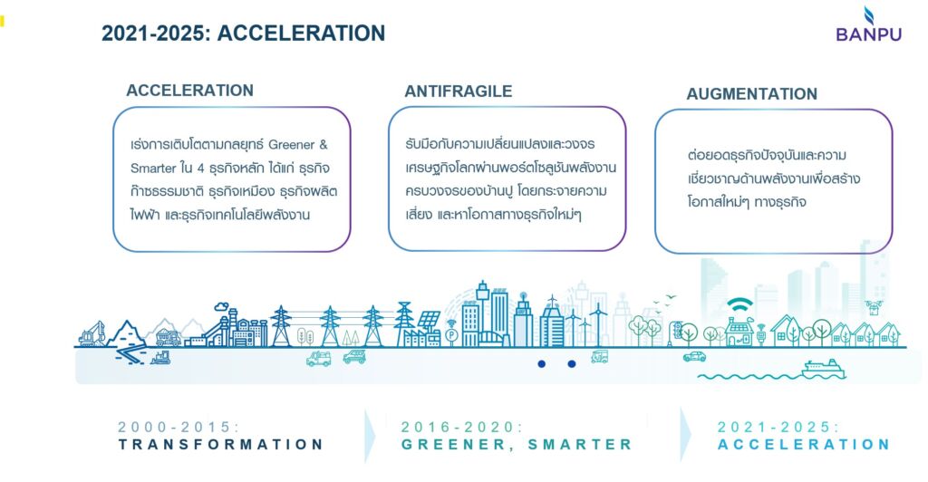 Acceleration – เร่งสร้างการเติบโตตามกลยุทธ์ Greener & Smarter ใน 4 ธุรกิจหลัก คือธุรกิจก๊าซธรรมชาติ ธุรกิจเหมือง ธุรกิจผลิตไฟฟ้า และธุรกิจเทคโนโลยีพลังงาน