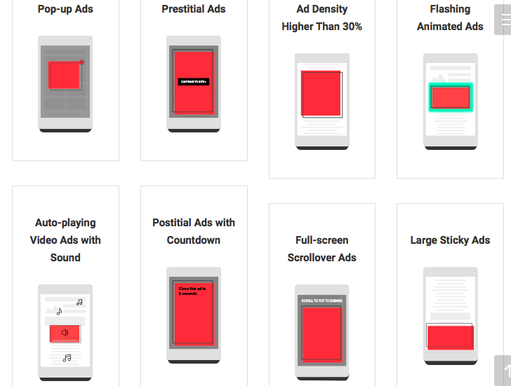 สำหรับ mobile รูปแบบที่ไม่มีใครปลื้มคือ pop-up ads, โฆษณาขนาดใหญ่เต็มจอ, โฆษณาที่มีความถี่มากจนกินพื้นที่เกิน 30% ของเพจ, โฆษณากระพริบ, โฆษณาเล่นอัตโนมัติพร้อมเสียง, โฆษณาเต็มจอที่นับถอยหลังจึงจะสามารถปิดได้, โฆษณาเลื่อนได้ที่มีขนาดเต็มหน้าจอ และแถบโฆษณายักษ์ด้านล่างจอที่ถูกตรึงไว้ไม่สามารถปิดได้