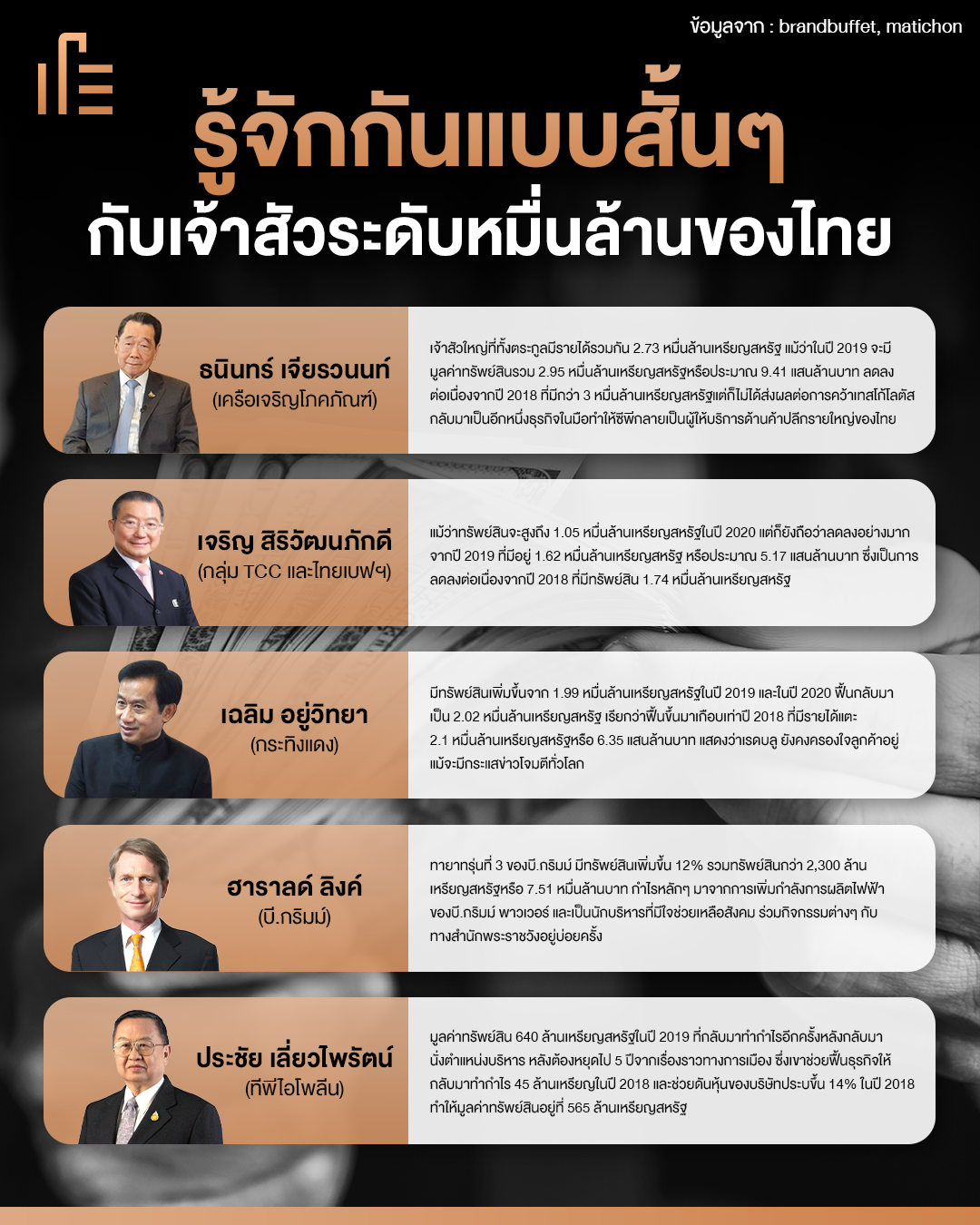 • เจริญ สิริวัฒนภักดี (กลุ่ม TCC และไทยเบฟเวอเรจ) แม้ว่าทรัพย์สินจะสูงถึง 1.05 หมื่นล้านเหรียญสหรัฐในปี 2020 แต่ก็ยังถือว่าลดลงอย่างมากจากปี 2019 ที่มีอยู่ 1.62 หมื่นล้านเหรียญสหรัฐ หรือประมาณ 5.17 แสนล้านบาท ซึ่งเป็นการลดลงต่อเนื่องจากปี 2018 ที่มีทรัพย์สิน 1.74 หมื่นล้านเหรียญสหรัฐ