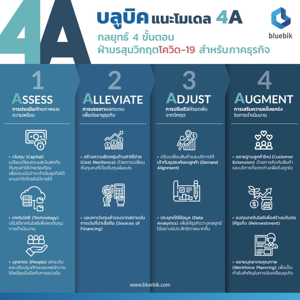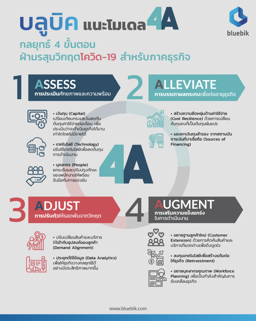 บลูบิค (Bluebik) บริษัทคอนซัลต์ชั้นนำผู้ให้บริการที่ปรึกษาด้านกลยุทธ์และการจัดการด้วยนวัตกรรมและเทคโนโลยี จึงได้แนะองค์กรธุรกิจปรับตัวและประยุกต์ใช้ “โมเดล 4A”เพื่อเป็นทางลัดช่วยให้รอดในยุคนี้