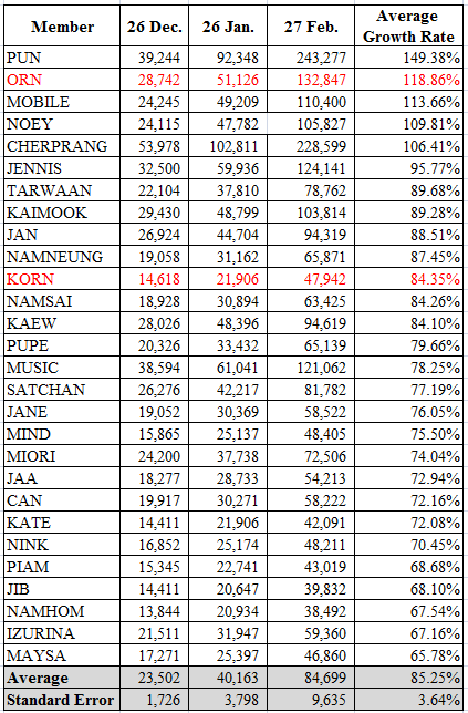 สมาชิกที่มีอัตราเติบโตน่าสนใจช่วงเดือน ก.พ. ที่โดดเด่นมากคืออร #OrnBNK48 หรือพัศชนันท์ เจียจิรโชติ มีอัตรา Growth Rate เพิ่มขึ้นเกือบ 40%